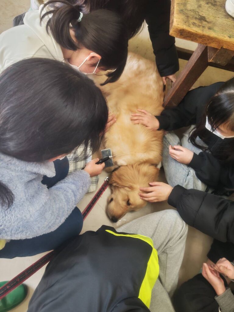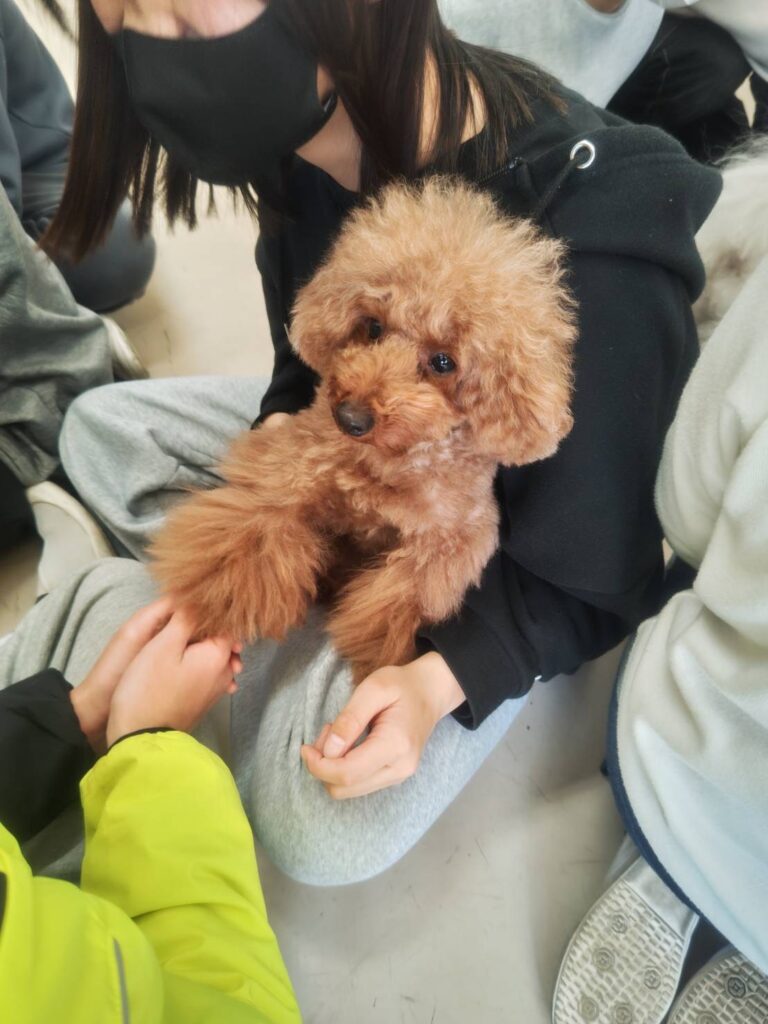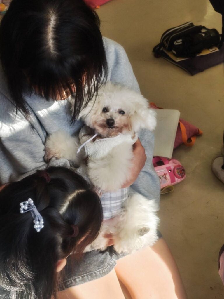 むいは生後4か月で生徒達と触れ合っています